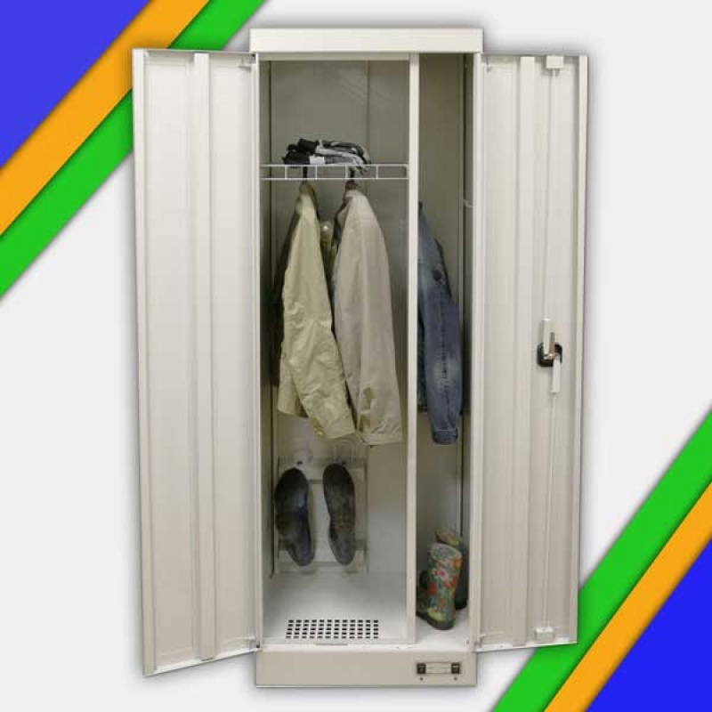 Сушильный шкаф Универсал-2000 применяется для сушки влажной и мокрой одежды и обуви. Шкаф имеет два вертикальных отдела, оснащен четырьмя штангами для обуви, сетчатой полкой для головных уборов или перчаток.
