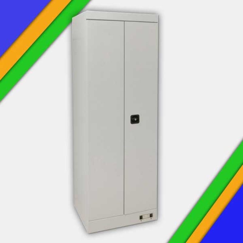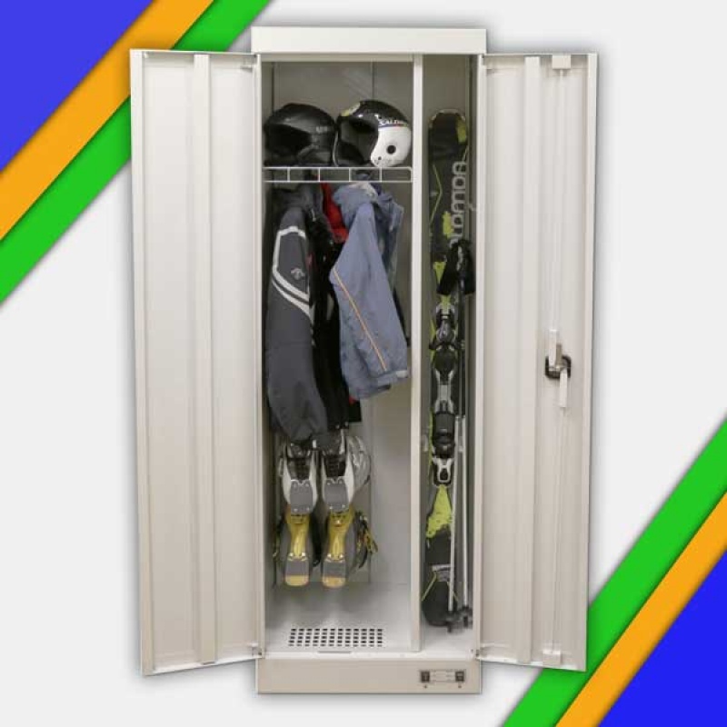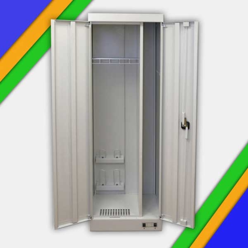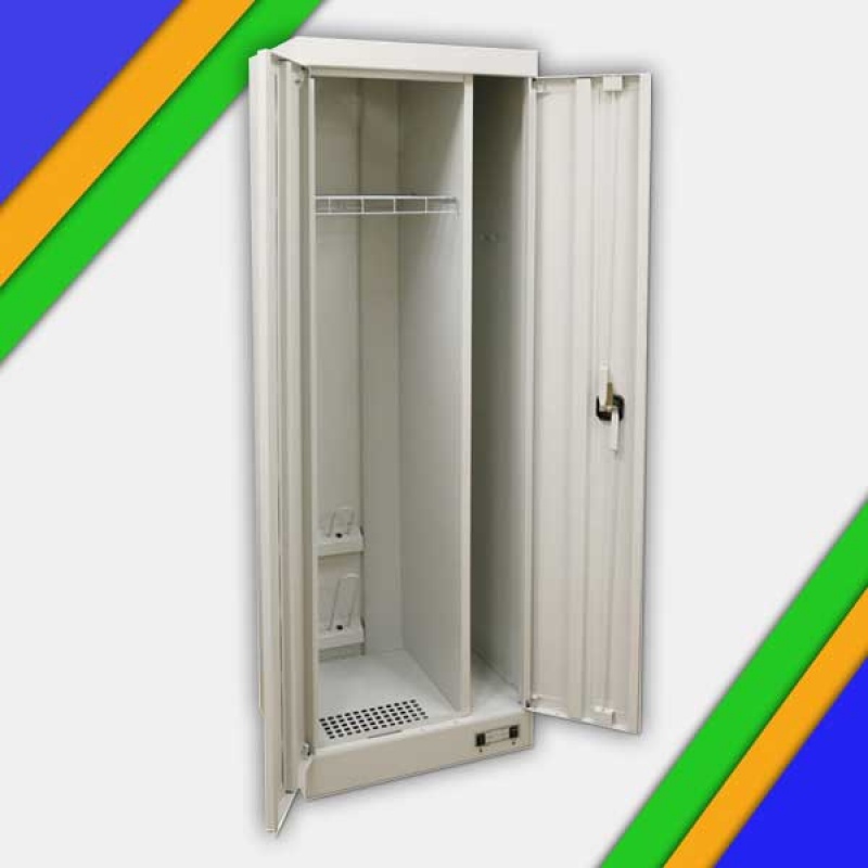 Шкафы представляют собой крепкую металлическую конструкцию, имеют два вертикальных отдела, оснащены четырьмя штангами для сушки обуви, сетчатой полкой для головных уборов, шарфов или перчаток.
