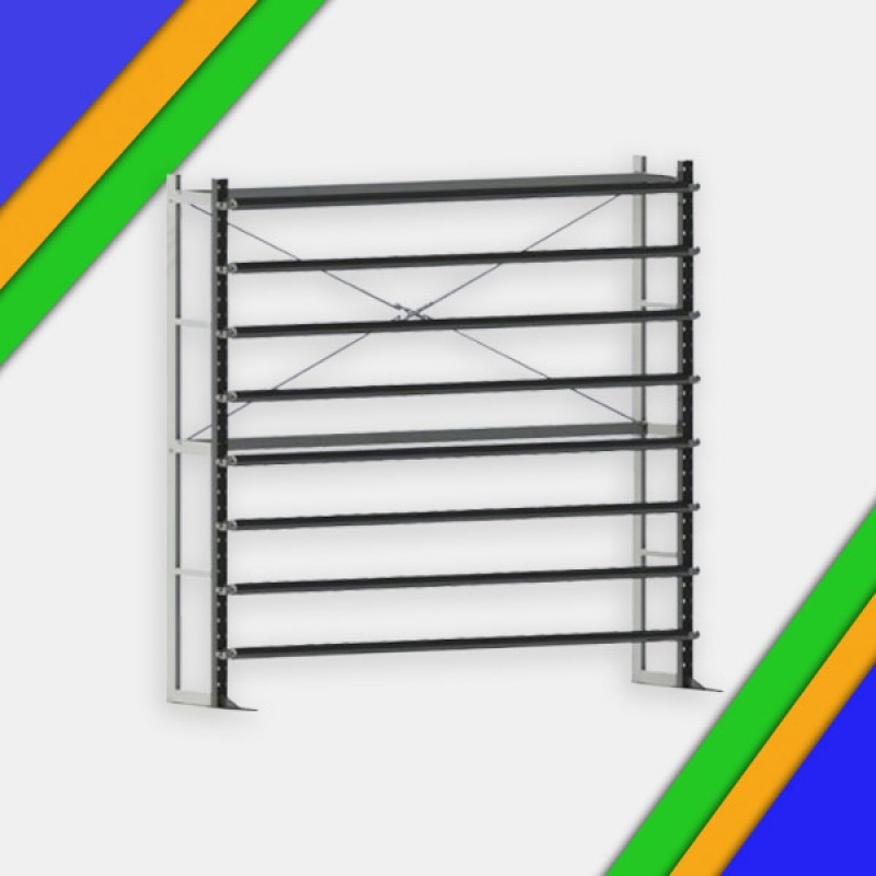 Стеллаж для размещения небольшого количества рулонного материала. Подходит как для торговых, так и для производственных площадей. Размотка материала производится непосредственно со стеллажа. Перфорированные стойки с шагом крепежных отверстий в 100мм позволяют размещать ролики самых разных диаметров.