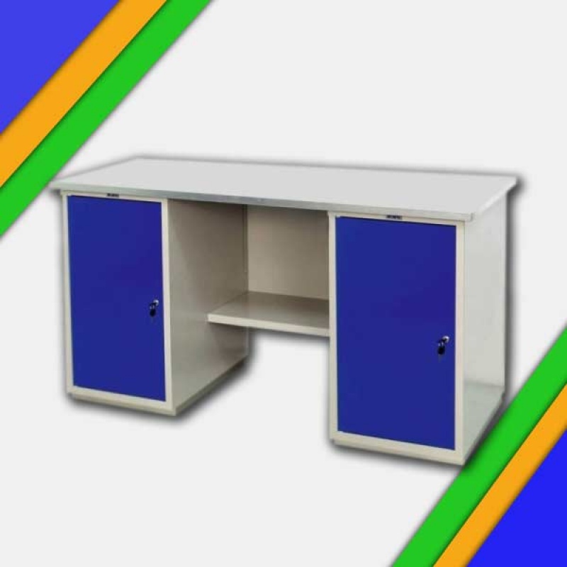 - Верстак окрашен порошковой краской, цвет покрытия корпуса серый шагрень (RAL 7038), лицевая панель дверцы тумбы – синий шагрень (RAL 5002)