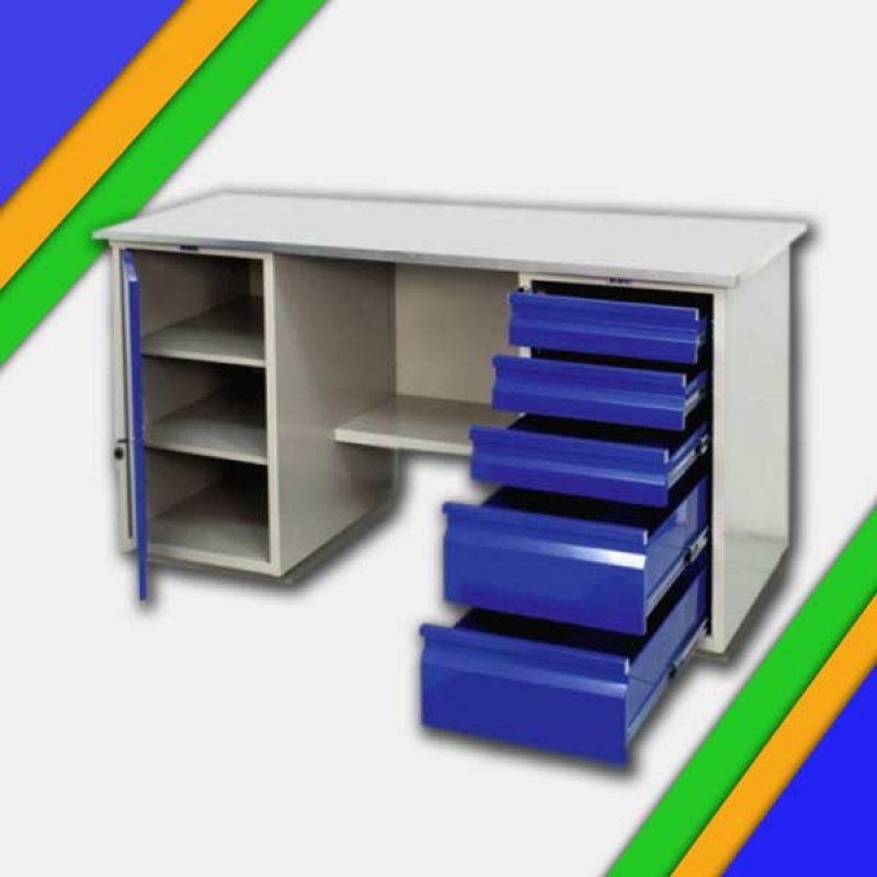 - Верстак окрашен порошковой краской, цвет покрытия корпуса серый шагрень (RAL 7038), лицевая панель дверцы тумбы – синий шагрень (RAL 5002)
