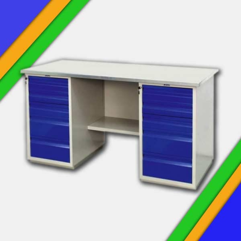 - Верстак состоит из 2 тумб WD5. Тумба укомплектована 5-ю выдвижными ящиками. Ящики открываются на телескопических направляющих. Нагрузка на ящик 30 кг. Все ящики закрываются на центральный ключевой замок.